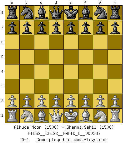 Last move : 0-1 2020 June 17 11:39:20 [Event "FICGS__CHESS__RAPID_C__000237"] [Site "FICGS"] [Date "2020.05.18"] [Round "1"] [White "Alhuda,Noor"] [Black "Sharma,Sahil"] [Result "0-1"] [WhiteElo "1500"] [BlackElo "1500"] 0-1 This chess game has been lost on time (started : 2020.05.18 7:15:2) Player Black won this chess game. Follow this game move after move (download)You are for me the Queen on d8 and I am the Pawn on d7 !! (Eduard Gufeld) Charakterschwächen offenbaren sich normalerweise während einer Schachpartie. (Garry Kasparov) Cuando tu casa esta en llamas, no puedes ser molestado por tus vecinos. O, como decinos en Ajedrez, si tu Rey esta bajo ataque, no te preocupa perder un Peón del lado de la Reina. (Gary Kasparov) Si je n'étais pas joueur d'échecs, je serais le meilleur dans quelque chose d'autre. (Anatoli Karpov) Ah, the Socrating method. The best way we have of teaching everything-apart from juggling chainsaws. (Gregory House, House M.D.)