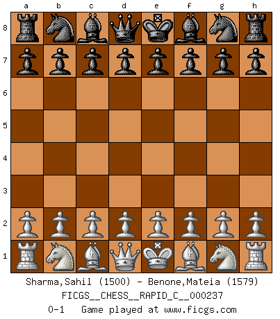 Last move : 0-1 2020 June 17 11:39:20 [Event "FICGS__CHESS__RAPID_C__000237"] [Site "FICGS"] [Date "2020.05.18"] [Round "1"] [White "Sharma,Sahil"] [Black "Benone,Mateia"] [Result "0-1"] [WhiteElo "1500"] [BlackElo "1579"] 0-1 This chess game has been lost on time (started : 2020.05.18 7:15:2) Player Black won this chess game. Follow this game move after move (download)My God, Bobby Fischer plays so simply. (Alexei Suetin) Rauchen ist dem Schachspieler bei seiner Arbeit, also im Wettkampf, untersagt. (Viktor Kortschnoi) Fischer es una tragedia del Ajedrez Americano a la par con Morphy y Pillsbury. (Mig Greengard) La tactique est l'élément le plus important du milieu de jeu. (Siegbert Tarrasch) What doesn't kill us makes us stronger. (Friedrich Nietzsche)