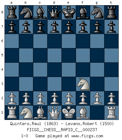 Last move : 1-0 2020 June 17 11:39:20 [Event "FICGS__CHESS__RAPID_C__000237"] [Site "FICGS"] [Date "2020.05.18"] [Round "1"] [White "Quintero,Raul"] [Black "Levano,Robert"] [Result "1-0"] [WhiteElo "1863"] [BlackElo "1500"] 1.Nf3 1-0 This chess game has been lost on time (started : 2020.05.18 7:15:2) Reti Opening Player White won this chess game. Follow this game move after move (download)Chess is really ninety nine percent calculation. (Soltis) Im Schach gibt es keinen Platz für Galanterie. (Irving Chernev) Botvinnik trataba de restarle el misterio al Ajedrez, siempre relacionandolo a situaciones de la vida ordinaria. El gustaba de llamar al Ajedrez un típico problema inexacto similar a aquellos de los cuales la gente siempre tiene que enfrentarse en la vida cotidiana. (Garry Kasparov) Le moment que je préfère le plus dans une rencontre, c'est celui où je sens que la personnalité de l'adversaire se brise. (Robert Fischer) Happy endings are just stories that haven't finished yet. (Jane Smith in Mr & Mrs Smith)