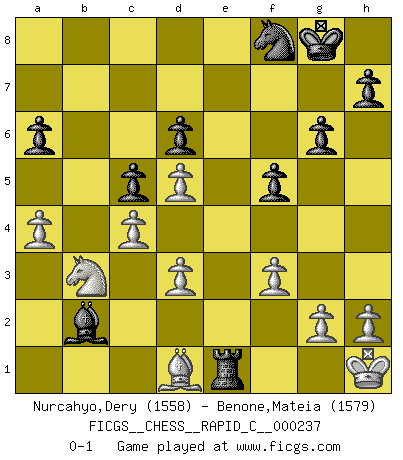 Last move : 0-1 2020 August 15 17:54:52 [Event "FICGS__CHESS__RAPID_C__000237"] [Site "FICGS"] [Date "2020.05.18"] [Round "1"] [White "Nurcahyo,Dery"] [Black "Benone,Mateia"] [Result "0-1"] [WhiteElo "1558"] [BlackElo "1579"] 1.b3 e5 2.Bb2 d6 3.e4 Nf6 4.f3 Be7 5.Ne2 O-O 6.c4 c5 7.Nbc3 Nc6 8.a3 Be6 9.Ng3 Nd4 10.Bd3 a6 11.Nd5 Bxd5 12.exd5 Rb8 13.O-O Qd7 14.Bxd4 exd4 15.Bf5 Qc7 16.Qc2 g6 17.Bd3 Rfe8 18.Rae1 Bf8 19.Ne4 Nd7 20.Qd1 Ne5 21.Qc2 Bg7 22.Be2 Qe7 23.d3 f5 24.Ng3 Nd7 25.Qd2 Qe3+ 26.Qxe3 dxe3 27.Bd1 Bb2 28.a4 b5 29.Ne2 bxa4 30.bxa4 Bd4 31.Nf4 e2 32.Kh1 exf1Q+ 33.Rxf1 Nf8 34.Ne2 Re3 35.Nc1 Rb1 36.Bc2 Ra1 37.Rd1 Bb2 38.Nb3 Rxd1+ 39.Bxd1 Re1+ 0-1 Nimzovich-Larsen attack : Modern variation Kingside Castling by player Black (move 5) Kingside Castling by player White (move 13) Promotion Queen by player Black (move 32) Player Black won this chess game. Follow this game move after move (download)Tactics flow from a superior position. (Bobby Fischer) Im Spitzenschach von heute geht es nur um Vorbereitung, um tiefgründige, sorgfältige Eröffnungsvorbereitung. (Nigel Short) La mitad de las variaciones que son calculadas en una partida de torneo, resultan ser completamente superfluas. Desafortunadamente, nadie sabe por adelantado cual mitad. (Jan Tinman) Si rien de grave n'est détecté lors de l'analyse d'une position, on joue alors le coup. Seconde règle de Blumenfeld. Have no fear of perfection - you'll never reach it. (Salvador Dali)