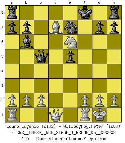 Last move : 1-0 2007 September 12 15:11:18 [Event "FICGS__CHESS__WCH_STAGE_1_GROUP_06__000003"] [Site "FICGS"] [Date "2007.07.11"] [Round "1"] [White "Louro,Eugenio"] [Black "Willoughby,Peter"] [Result "1-0"] [WhiteElo "2102"] [BlackElo "1280"] 1.e4 e6 2.d4 d5 3.Nd2 c5 4.Ngf3 Nc6 5.exd5 Qxd5 6.Bc4 Qd7 7.dxc5 Bxc5 8.O-O Nge7 9.Ne4 Bb6 10.Nd6+ Kf8 11.Ng5 Ne5 12.Bb5 Qc7 13.Bf4 f6 14.Bxe5 fxe5 15.Nxc8 Qxc8 16.Bd7 Qc5 17.Nxe6+ 1-0 French : Tarrasch, Open variation Kingside Castling by player White (move 8) Player White won this chess game. Follow this game move after move (download)The Chess pieces are the block alphabet which shapes thoughts; and these thoughts, although making a visual design on the chessboard, express their beauty abstractly, like a poem. (Marcel Duchamp) Mein Gehirn das ist mein zweitwichtigstes Organ [Aus dem Film: Der Schläfer]. (Woody Allen) La maestría del Ajedrez consiste esencialmente en analizar posiciónes de Ajedrez con precisión. (Mikhail Botvinnik) Toutes les manuvres exécutées sur une colonne ouverte ont pour but ultime l'intrusion définitive sur la septième ou la huitième rangée, en plein cur de la position ennemie. (Aaron Nimzovitch) You cannot beat a roulette table unless you steal money from it. (Albert Einstein)