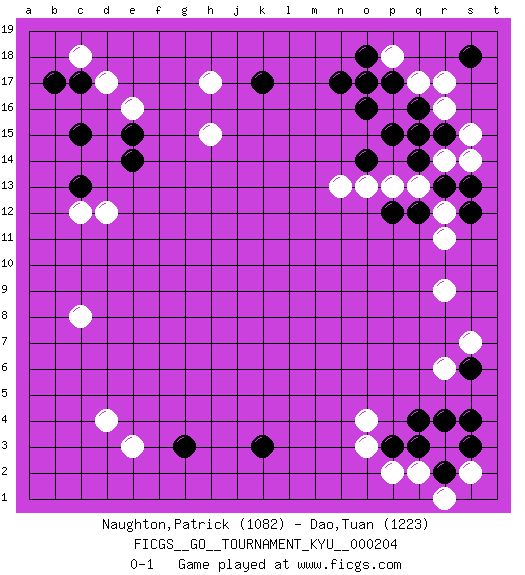 Last move : 0-1 2020 July 22 1:7:18 [Event "FICGS__GO__TOURNAMENT_KYU__000204"] [Site "FICGS"] [Date "2020.05.19"] [Round "1"] [Black "Naughton,Patrick"] [White "Dao,Tuan"] [Result "0-1"] [Rating 1 "1082"] [Rating 2 "1223"] 1.q16 d4 2.q4 d17 3.c15 d12 4.e14 e16 5.c13 c12 6.c17 c18 7.b17 h17 8.e15 c8 9.k3 r6 10.s4 r9 11.r13 o3 12.p3 o4 13.g3 e3 14.k17 h15 15.n17 r17 16.s18 r16 17.r15 s15 18.q15 s14 19.s13 q17 20.p17 p18 21.o18 p16 22.o17 r14 23.q14 q13 24.q12 p13 25.p15 r12 26.s12 r11 27.p12 o13 28.o14 n13 29.o16 r3 30.r4 p2 31.q3 q2 32.r2 s2 33.s3 r1 34.s6 s7 0-1 Here are the names of the openings (joseki) played in the four corners : Corner d16 : d17 c15 Komoku (Somok, Xiao~mu`) 3-4 Point. The komoku (3-4) point is the traditional corner enclosure move.. Ikken Kakari (Hankan Keolch'im, Yi Gua`jiao~, 1-Space Low Pincer). The small knight move is the basic approach move to the 3-4 point stone. It has been continually used for over four centuries. There are limitless variations, with new moves constantly being discovered. Black 2 opens the door to a treaure store of joseki. Corner q4 : q4 r6 Hoshi (Hwajeom, Seongjeom, Xingwei`) 4-4 Point. The star or hoshi (4-4) point, emphasizing influence at the potential expense of territory. Ikken Kakari (Hankan Keolch'im, Yi Gua`jiao~, 1-Space Low Approach). White 2 is the standard approach move to the 4-4. Player White won this Go (weiqi, baduk) game. Follow this game move after move (download)The game plays itself, the players don't control it. (Pierre Audouard) Somehow our devils are never quite what we expect when we meet them face to face. (Nelson DeMille)