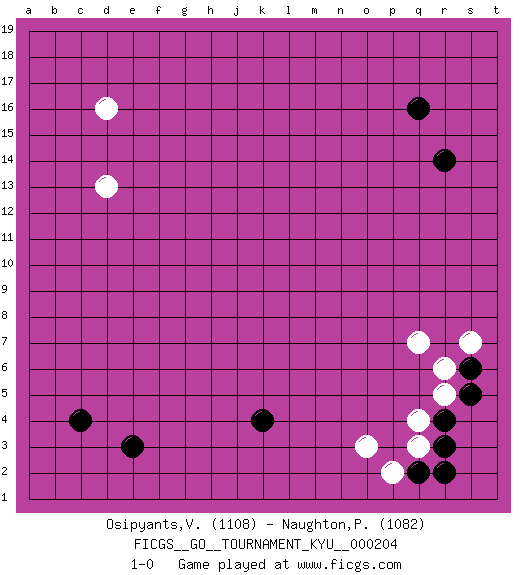 Last move : 1-0 2020 July 1 1:3:0 [Event "FICGS__GO__TOURNAMENT_KYU__000204"] [Site "FICGS"] [Date "2020.05.19"] [Round "1"] [Black "Osipyants,Vladimir"] [White "Naughton,Patrick"] [Result "1-0"] [Rating 1 "1108"] [Rating 2 "1082"] 1.q16 d16 2.c4 q4 3.e3 d13 4.k4 q7 5.r3 q3 6.r4 r5 7.s5 r6 8.s6 s7 9.q2 p2 10.r2 o3 11.r14 1-0 This go game has been lost on time (started : 2020.05.19 17:3:34) Here are the names of the openings (joseki) played in the four corners : Player Black won this Go (weiqi, baduk) game. Follow this game move after move (download)One big eye kills one small eye. (Anonymous) If you ain't just a little scared when you enter a casino, you are either very rich or you haven't studied the games enough. (Pappy)