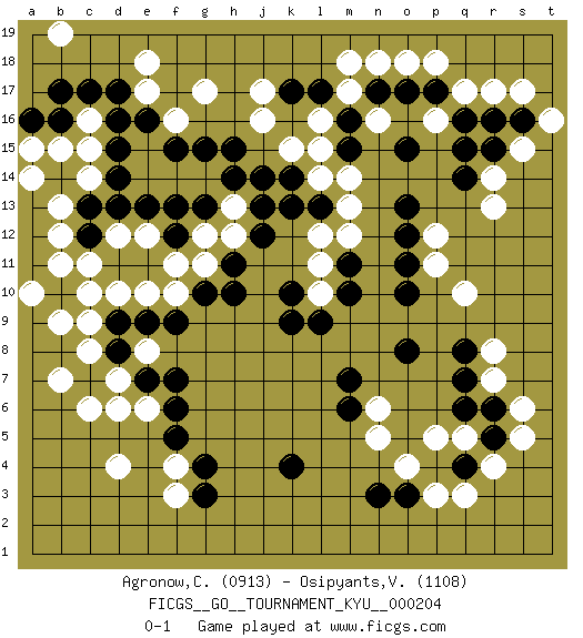 Last move : 0-1 2020 September 9 15:14:26 [Event "FICGS__GO__TOURNAMENT_KYU__000204"] [Site "FICGS"] [Date "2020.05.19"] [Round "1"] [Black "Agronow,Cosmo"] [White "Osipyants,Vladimir"] [Result "0-1"] [Rating 1 "0913"] [Rating 2 "1108"] 1.d16 d4 2.q16 r4 3.c7 c6 4.e7 d6 5.f5 p3 6.c12 q10 7.o15 j16 8.j14 m17 9.g15 g17 10.h10 d7 11.d8 c8 12.d9 c9 13.c10 b7 14.o10 m14 15.o13 r13 16.q8 r8 17.q7 r7 18.r6 s6 19.r5 s5 20.q4 q3 21.k4 n5 22.m6 n6 23.m7 e6 24.f6 e8 25.f7 d10 26.e9 e10 27.f9 c11 28.n3 o4 29.o3 q5 30.q6 p5 31.o8 m12 32.m10 k15 33.k14 l15 34.d11 b11 35.b10 b9 36.e11 f10 37.g10 f11 38.f12 g11 39.h11 g12 40.g13 h12 41.j12 h13 42.h14 a10 43.j13 c10 44.f13 f3 45.g3 f4 46.g4 l11 47.k10 r17 48.r16 q17 49.p17 p18 50.o17 o18 51.n17 n18 52.m16 l16 53.m15 l14 54.l13 m13 55.m11 l12 56.k13 b12 57.c13 b13 58.b14 c14 59.d14 c15 60.b16 b15 61.d15 d12 62.d13 e12 63.e13 c16 64.c17 a14 65.b17 e17 66.d17 e18 67.e16 f16 68.f15 b19 69.a16 a15 70.h15 l10 71.l9 p12 72.o12 p11 73.o11 s17 74.l17 m18 75.k17 j17 76.k9 s15 77.s16 t16 78.r15 r14 79.q14 p16 80.q15 n16 0-1 Here are the names of the openings (joseki) played in the four corners : Corner d4 : d4 c7 Hoshi (Hwajeom, Seongjeom, Xingwei`) 4-4 Point. The star or hoshi (4-4) point, emphasizing influence at the potential expense of territory. Niken Kakari (Dukan Keolch'im, E`r Gua`jiao~, 2-Space Low Approach). White typically answers by 7-3 or 3-5 (which is not joseki). Player White won this Go (weiqi, baduk) game. Follow this game move after move (download)Don't make territory near thickness. (Anonymous) The beginning of wisdom is silence. The second step is listening. (Unknown)