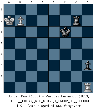 Last move : 1-0 2007 November 26 0:30:22 [Event "FICGS__CHESS__WCH_STAGE_1_GROUP_06__000003"] [Site "FICGS"] [Date "2007.07.11"] [Round "1"] [White "Burden,Don"] [Black "Vasquez,Fernando"] [Result "1-0"] [WhiteElo "1998"] [BlackElo "1819"] 1.e4 e5 2.Nf3 d6 3.d4 exd4 4.Nxd4 Nf6 5.Nc3 Be7 6.Bf4 a6 7.Qd2 O-O 8.O-O-O Re8 9.f3 Nc6 10.Kb1 Nxd4 11.Qxd4 b5 12.g4 Be6 13.Qg1 c6 14.Ne2 d5 15.h4 Qa5 16.Nd4 Bc5 17.e5 Nd7 18.Nxc6 Qc7 19.Nd4 Nxe5 20.Qg3 Bd6 21.h5 Rac8 22.g5 Nc4 23.Bxd6 Qxd6 24.Qxd6 Nxd6 25.Bd3 Bd7 26.g6 h6 27.gxf7+ Nxf7 28.f4 Nd8 29.Bg6 Re3 30.Rde1 Rxe1+ 31.Rxe1 Nc6 32.Nxc6 Rxc6 33.Re7 Rd6 34.a3 Kf8 35.Rf7+ Kg8 36.f5 a5 37.Kc1 d4 38.Kd2 b4 39.axb4 axb4 40.b3 Bc6 41.Rc7 Kf8 42.Kd3 Bb5+ 43.Ke4 Bd7 44.Kf4 d3 45.cxd3 Rxd3 46.f6 Rd1 47.fxg7+ Kg8 48.Ke5 Re1+ 49.Be4 Bh3 50.Re7 Bg2 51.Kf5 Rf1+ 52.Kg6 Bxe4+ 53.Rxe4 Rg1+ 54.Kf6 Rxg7 55.Rxb4 Rg5 56.Rh4 Kf8 57.b4 Kg8 58.Ke6 Kg7 59.Kd6 Rf5 60.Rd4 Rxh5 61.Rd5 Rh1 62.b5 h5 63.b6 Rb1 64.Kc7 Rc1+ 65.Kb8 h4 66.Rh5 Rh1 67.b7 h3 68.Rb5 Rg1 69.Rb2 Rg2 70.Rb1 Kf6 71.Ka7 Rg7 72.Rh1 1-0 Philidor : Exchange variation Kingside Castling by player Black (move 7) Queenside Castling by player White (move 8) 10 pieces endgame at move 52 : White KRPPP , Black KRBPP WHITE : King + 1 Rook 3 Pawns BLACK : King + 1 Rook 1 Bishop 2 Pawns 9 pieces endgame at move 53 : White KRPPP , Black KRPP WHITE : King + 1 Rook 3 Pawns BLACK : King + 1 Rook 2 Pawns 8 pieces endgame at move 54 : White KRPP , Black KRPP WHITE : King + 1 Rook 2 Pawns BLACK : King + 1 Rook 2 Pawns 7 pieces endgame at move 55 : White KRPP , Black KRP WHITE : King + 1 Rook 2 Pawns BLACK : King + 1 Rook 1 Pawn 6 pieces endgame at move 60 : White KRP , Black KRP WHITE : King + 1 Rook 1 Pawn BLACK : King + 1 Rook 1 Pawn Player White won this chess game. Follow this game move after move (download)There is no remorse like the remorse of Chess. (H. G. Wells) Du kannst im Schach nur gut werden, wenn du das Spiel liebst. (Robert James Fischer) Fischer era un maestro de claridad y un Rey del posicionamiento astuto. Sus oponentes podían ver hacia donde se dirigía pero eran impotentes para detenerlo. (Bruce Pandolfini) Le pion, dans sa simplicité, marche droit devant lui, mais lorsqu'il prend, il le fait obliquement? Ainsi l'homme, tant qu'il reste pauvre, marche dans la droiture et vit honnêtement, mais lorsqu'il recherche les honneurs, il flatte, se parjure et, par les voies obliques, cherche une position supérieure sur l'échiquier du monde. (Jean de Galles) I take risks, sometimes patients die, but not taking risks causes more patients to die. So I guess my biggest problem is I've been cursed with the ability to do the math. (Gregory House, House M.D.)