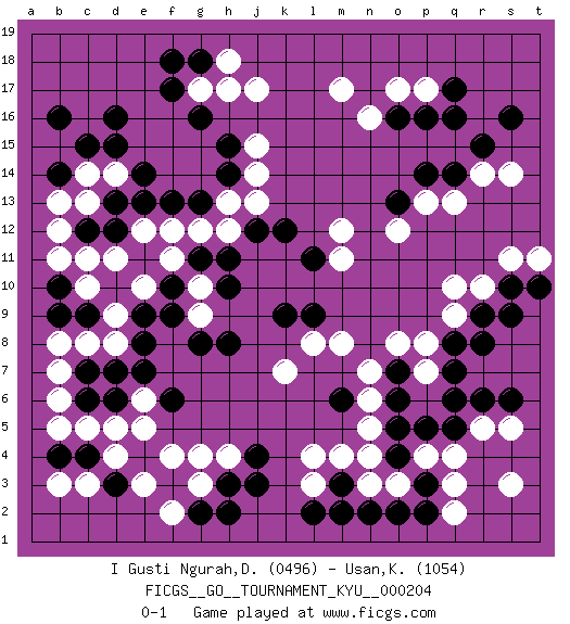 Last move : 0-1 2020 December 17 12:5:15 [Event "FICGS__GO__TOURNAMENT_KYU__000204"] [Site "FICGS"] [Date "2020.05.19"] [Round "1"] [Black "I Gusti Ngurah,Divayana"] [White "Usan,Kavi"] [Result "0-1"] [Rating 1 "0496"] [Rating 2 "1054"] 1.q16 d4 2.d16 q4 3.c6 f4 4.b4 c3 5.h3 h4 6.f3 g3 7.g2 g4 8.j3 f2 9.h2 l4 10.l2 n3 11.m3 l3 12.m2 m4 13.n2 o3 14.o2 q2 15.r6 r5 16.q6 q10 17.r9 r10 18.o6 r14 19.o16 c14 20.f17 d11 21.c9 c10 22.b9 m17 23.s16 j17 24.b16 b3 25.c4 d5 26.d3 e3 27.b10 b11 28.c12 c11 29.d13 b12 30.f13 d14 31.e14 c13 32.d12 e12 33.e13 e10 34.d15 g17 35.g18 h18 36.g16 h17 37.f18 p17 38.q17 o17 39.p16 n16 40.m6 n5 41.o5 n6 42.p3 p4 43.o4 n4 44.p2 q3 45.q5 s5 46.s6 s3 47.p5 n7 48.o7 b5 49.d6 c5 50.e8 g9 51.g8 e6 52.e7 b7 53.c7 b6 54.f9 g10 55.f6 e5 56.h8 c8 57.d7 d9 58.f10 f11 59.e9 d8 60.b14 b13 61.c15 q9 62.r8 o8 63.s10 s11 64.t10 t11 65.s9 p7 66.q8 p8 67.q7 k7 68.g11 b8 69.h10 g12 70.h11 f12 71.g13 h12 72.j12 h13 73.h14 j13 74.k12 j14 75.h15 j15 76.k9 l8 77.l9 m8 78.j4 m11 79.l11 m12 80.q14 q13 81.p14 p13 82.o13 o12 83.r15 s14 0-1 This go game has been lost on time (started : 2020.05.19 17:3:34) Follow this game move after move (download)Learn the eye-stealing tesuji. (Anonymous) There are two types of people in this world, good and bad. The good sleep better, but the bad seem to enjoy the waking hours much more. (Woody Allen)