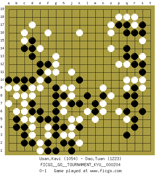Last move : 0-1 2020 August 25 16:42:54 [Event "FICGS__GO__TOURNAMENT_KYU__000204"] [Site "FICGS"] [Date "2020.05.19"] [Round "1"] [Black "Usan,Kavi"] [White "Dao,Tuan"] [Result "0-1"] [Rating 1 "1054"] [Rating 2 "1223"] 1.q16 d4 2.q3 d17 3.r9 q5 4.r5 r6 5.r4 o17 6.q14 k16 7.q6 q9 8.r7 r10 9.q8 s9 10.r8 q10 11.s11 s10 12.r12 q12 13.q13 p12 14.d15 c15 15.c14 c16 16.d13 e14 17.d14 f16 18.d10 d9 19.c9 s13 20.s12 c8 21.c10 d8 22.c3 d3 23.c4 d5 24.d2 e2 25.c2 c5 26.b5 b6 27.b4 e10 28.e11 f11 29.f10 e9 30.f12 g11 31.e12 g12 32.k4 o14 33.p17 o16 34.g9 j9 35.g7 j5 36.j7 k5 37.g5 h3 38.h4 j4 39.g3 g2 40.h2 j3 41.f2 f3 42.g1 f4 43.g4 e1 44.f1 h6 45.g6 h7 46.h8 j8 47.j2 k2 48.j1 g13 49.e6 b8 50.d6 c6 51.e5 b9 52.b10 a9 53.a10 a7 54.d7 c7 55.f5 s15 56.r13 r17 57.r16 p18 58.q17 q18 59.s17 r18 60.s16 o8 61.k7 h9 62.g8 p6 63.s6 l6 64.l8 n6 65.k10 j11 66.m6 m5 67.m7 n7 68.n8 n9 0-1 Here are the names of the openings (joseki) played in the four corners : Corner q16 : q16 o17 Hoshi (Hwajeom, Seongjeom, Xingwei`) 4-4 Point. The star or hoshi (4-4) point, emphasizing influence at the potential expense of territory. Ikken Kakari (Hankan Keolch'im, Yi Gua`jiao~, 1-Space Low Approach). White 2 is the standard approach move to the 4-4. Corner d16 : d17 d15 Komoku (Somok, Xiao~mu`) 3-4 Point. The komoku (3-4) point is the traditional corner enclosure move.. Ikken Takagakari (Hankan Nop'dakeolch'im, Yi Gaogua`jiao~, 1-Space High Approach). The 5-4 approach move has become more popular in modern times, as modern Go emphasizes speed and influence. Player White won this Go (weiqi, baduk) game. Follow this game move after move (download)The poor player plays the opponent's game for him. (Anonymous) Never was anything great achieved without danger. (Niccolo Machiavelli)
