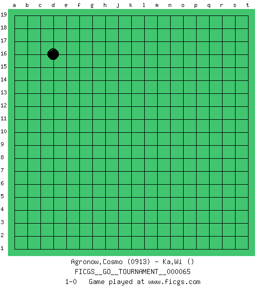 Last move : 1-0 2020 June 21 2:22:59 [Event "FICGS__GO__TOURNAMENT__000065"] [Site "FICGS"] [Date "2020.05.21"] [Round "1"] [Black "Agronow,Cosmo"] [White "Ka,Wi"] [Result "1-0"] [Rating 1 "0913"] 1.d16 1-0 This go game has been lost on time (started : 2020.05.21 12:22:40) Here are the names of the openings (joseki) played in the four corners : Player Black won this Go (weiqi, baduk) game. Follow this game move after move (download)There is no territory in the centre. (Anonymous) When you stop learning you start dying. (M. Scott Adams)
