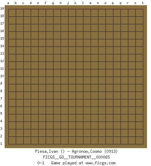Last move : 0-1 2020 June 20 12:59:48 [Event "FICGS__GO__TOURNAMENT__000065"] [Site "FICGS"] [Date "2020.05.21"] [Round "1"] [Black "Plesa,Ivan"] [White "Agronow,Cosmo"] [Result "0-1"] [Rating 2 "0913"] 0-1 This go game has been lost on time (started : 2020.05.21 12:22:40) Here are the names of the openings (joseki) played in the four corners : Player White won this Go (weiqi, baduk) game. Follow this game move after move (download)If you cannot succeed, then die gloriously. (Chinese proverb) In fact if nothing is done against this teddy bear, hereby I announce that I would quit chess, rapid chess, blitz chess, postal chess, email chess, server chess and correspondence chess I will then switch to a table game where teddy bears aren't going to be seen for a while, like Poker, or Roulette, all 18+ games. (Elmer Valderrama)