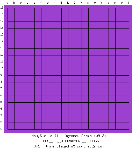 Last move : 0-1 2020 June 20 12:59:48 [Event "FICGS__GO__TOURNAMENT__000065"] [Site "FICGS"] [Date "2020.05.21"] [Round "1"] [Black "Hsu,Stella"] [White "Agronow,Cosmo"] [Result "0-1"] [Rating 2 "0913"] 0-1 This go game has been lost on time (started : 2020.05.21 12:22:40) Here are the names of the openings (joseki) played in the four corners : Player White won this Go (weiqi, baduk) game. Follow this game move after move (download)Extend one hand from the cutting points. (Anonymous) For peace of mind, resign as general manager of the universe. (Douglas Adams)