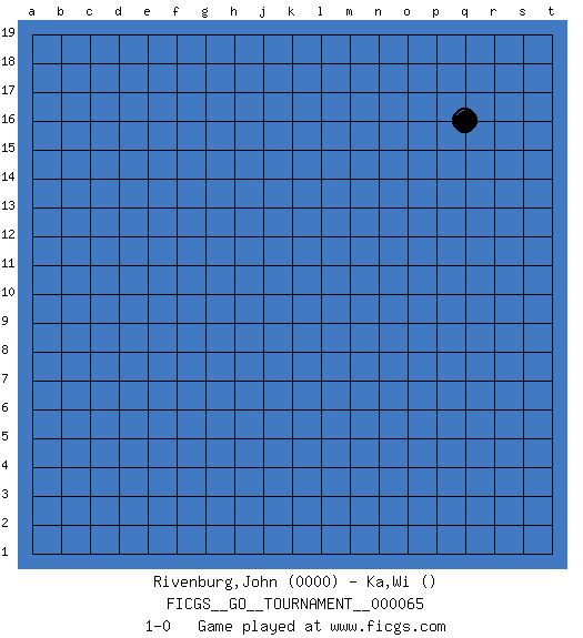 Last move : 1-0 2020 June 21 14:47:34 [Event "FICGS__GO__TOURNAMENT__000065"] [Site "FICGS"] [Date "2020.05.21"] [Round "1"] [Black "Rivenburg,John"] [White "Ka,Wi"] [Result "1-0"] [Rating 1 "0000"] 1.q16 1-0 This go game has been lost on time (started : 2020.05.21 12:22:40) Here are the names of the openings (joseki) played in the four corners : Player Black won this Go (weiqi, baduk) game. Follow this game move after move (download)White is always trying to kill a bigger group than black is trying to save. (Anonymous) If you are going through hell, keep going. (Winston Churchill)