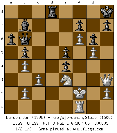 Last move : 1/2-1/2 2007 October 4 12:8:21 [Event "FICGS__CHESS__WCH_STAGE_1_GROUP_06__000003"] [Site "FICGS"] [Date "2007.07.11"] [Round "1"] [White "Burden,Don"] [Black "Kragujevcanin,Stole"] [Result "1/2-1/2"] [WhiteElo "1998"] [BlackElo "1600"] 1.e4 c5 2.Nf3 d6 3.d4 cxd4 4.Nxd4 Nf6 5.Nc3 a6 6.Bc4 e6 7.Bb3 Nbd7 8.f4 Nc5 9.f5 Be7 10.Qf3 O-O 11.Be3 e5 12.Nde2 Nxb3 13.axb3 b5 14.O-O Qc7 15.g4 Bb7 16.g5 Nxe4 17.Nxe4 d5 18.f6 dxe4 19.Qf2 Bd8 20.Rad1 g6 21.Nc3 Qc8 22.Qh4 Kh8 23.b4 Qc6 24.Qh6 Rg8 25.Qh3 Bb6 26.Nd5 Bxe3+ 27.Nxe3 Qb6 28.Kf2 Rac8 29.c3 Rcd8 30.Rxd8 Rxd8 1/2-1/2 Sicilian : Najdorf, Lipnitzky attack Kingside Castling by player Black (move 10) Kingside Castling by player White (move 14) This chess game ended in a draw. Follow this game move after move (download)In Chess, just as in life, today's bliss may be tomorrow's poison. (Assaic) Mit Schach schule ich mein Gefühl für Geometrie, was für Tennis und Schach gleichermaßen wichtig ist. (Boris Becker) Cuando tu no sabes absolutamente que mas hacer, es tiempo de entrar en pánico. (John van der Wiel) Les Cavaliers se révèlent fort utiles dans les positions fermées. D'habitude, les Fous sont un peu plus forts que les Cavaliers dans les positions ouvertes. Qu'on le veuille ou non, il restera toujours des exceptions ! You lose, general Kenobi. (General Grievous in Star Wars ep.3)