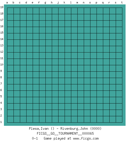 Last move : 0-1 2020 June 20 12:59:48 [Event "FICGS__GO__TOURNAMENT__000065"] [Site "FICGS"] [Date "2020.05.21"] [Round "1"] [Black "Plesa,Ivan"] [White "Rivenburg,John"] [Result "0-1"] [Rating 2 "0000"] 0-1 This go game has been lost on time (started : 2020.05.21 12:22:40) Here are the names of the openings (joseki) played in the four corners : Player White won this Go (weiqi, baduk) game. Follow this game move after move (download)Big groups never die. (Anonymous) The difference between stupidity and genius is that genius has its limits. (Murphy)