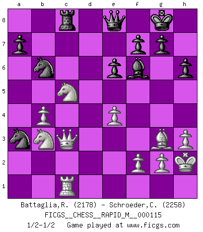 Last move : 1/2-1/2 2020 May 28 15:59:1 [Event "FICGS__CHESS__RAPID_M__000115"] [Site "FICGS"] [Date "2020.05.21"] [Round "1"] [White "Battaglia,Roberto"] [Black "Schroeder,Christoph"] [Result "1/2-1/2"] [WhiteElo "2178"] [BlackElo "2258"] 1.d4 e6 2.c4 d5 3.Nf3 Nf6 4.Nc3 Be7 5.Bf4 O-O 6.e3 b6 7.Rc1 c5 8.dxc5 bxc5 9.Be2 Nc6 10.O-O Ba6 11.cxd5 Bxe2 12.Qxe2 Nxd5 13.Bg3 Qb6 14.a3 Rac8 15.Rfd1 Rfd8 16.Na4 Qa5 17.Qc2 h6 18.h3 Qb5 19.Kh2 Na5 20.e4 Nb6 21.Rxd8+ Rxd8 22.Nxc5 Rc8 23.b4 Nac4 24.Nd4 Qe8 25.Ndb3 Nxa3 26.Qc3 Bf6 1/2-1/2 Queen's pawn Kingside Castling by player Black (move 5) Kingside Castling by player White (move 10) This chess game ended in a draw. Follow this game move after move (download)The tactician must know what to do whenever something needs doing; the strategist must know what to do when nothing needs doing. (Savielly Tartakover) Wenn sie aufgeben, dann danke ich Ihnen für das Spiel (Eventualzug beim Fernschach). (Anonymous) Diferente gente reacciona diferentemente en aceptar la derrota. (Bobby Fischer) Les erreurs sont comme les malheurs, elles n'arrivent jamais seules. (Siegbert Tarrasch) Computer Science is no more about computers than astronomy is about telescopes. (Edsger W. Dijkstra)