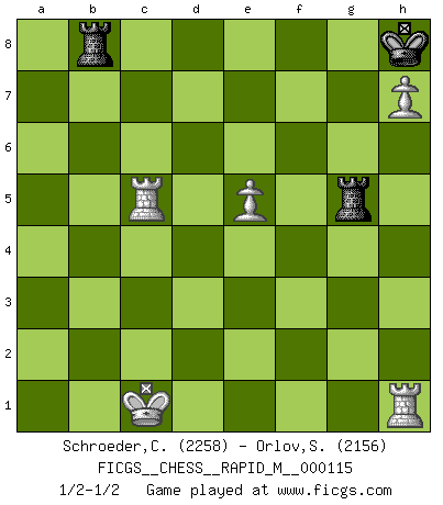 Last move : 1/2-1/2 2020 August 4 13:50:28 [Event "FICGS__CHESS__RAPID_M__000115"] [Site "FICGS"] [Date "2020.05.21"] [Round "1"] [White "Schroeder,Christoph"] [Black "Orlov,Vladimir"] [Result "1/2-1/2"] [WhiteElo "2258"] [BlackElo "2156"] 1.e4 e6 2.d4 d5 3.Nc3 Nf6 4.e5 Nfd7 5.f4 c5 6.Nf3 Nc6 7.Be3 cxd4 8.Nxd4 Bc5 9.Qd2 O-O 10.O-O-O a6 11.h4 Nxd4 12.Bxd4 b5 13.a3 Rb8 14.Bxc5 Nxc5 15.b4 Nd7 16.h5 Qc7 17.h6 g6 18.Rh3 Nb6 19.g4 Bd7 20.Qd4 Rfc8 21.Rd2 Qd8 22.Rf2 Qe7 23.Rhf3 Rc6 24.Nd1 Nc4 25.Ne3 Nxe3 26.Rxe3 a5 27.f5 axb4 28.axb4 Ra6 29.fxg6 hxg6 30.Qf4 Be8 31.Rc3 d4 32.Rc5 Ra4 33.Rf3 Rba8 34.Qf6 Qxf6 35.Rxf6 d3 36.Bxd3 Rxb4 37.g5 Rg4 38.Bxg6 Rxg5 39.h7+ Kh8 40.Bxf7 Bxf7 41.Rxf7 Rb8 42.Re7 b4 43.Rxe6 b3 44.cxb3 Rxb3 45.Rh6 Rb8 46.Rh1 1/2-1/2 French : Steinitz, Boleslavsky variation Kingside Castling by player Black (move 9) Queenside Castling by player White (move 10) 10 pieces endgame at move 43 : White KRRPPP , Black KRRP WHITE : King + 2 Rooks 3 Pawns BLACK : King + 2 Rooks 1 Pawn 9 pieces endgame at move 44 : White KRRPPP , Black KRR WHITE : King + 2 Rooks 3 Pawns BLACK : King + 2 Rooks 8 pieces endgame at move 44 : White KRRPP , Black KRR WHITE : King + 2 Rooks 2 Pawns BLACK : King + 2 Rooks This chess game ended in a draw. Follow this game move after move (download)Not only will I predict his triumph over Botvinnik, but I'll go further and say that he'll probably be the greatest Chess player that ever lived. (John Collins) Habe Mut, dich deines eigenen Verstandes zu bedienen. (Immanuel Kant) El Ajedrez tiene tanto misterio como las mujeres. (Purdy) Echiquier : carré parfait, comme la Jérusalem nouvelle décrite par l'auteur de l'Apocalypse, huit cases sur huit, exaltation du chiffre 4, symbole du cosmos aux quatre horizons... où le noir et le blanc, l'ombre et la lumière, le mal et le bien s'entremêlent et se conjuguent. (Robert Couffignal, Le Gambit du poète) The best teachers teach from the heart, not from the book. (Author unknown)