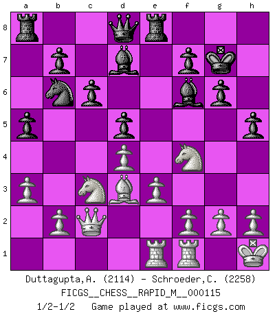 Last move : 1/2-1/2 2020 July 6 21:35:2 [Event "FICGS__CHESS__RAPID_M__000115"] [Site "FICGS"] [Date "2020.05.21"] [Round "1"] [White "Duttagupta,Aniruddha"] [Black "Schroeder,Christoph"] [Result "1/2-1/2"] [WhiteElo "2114"] [BlackElo "2258"] 1.d4 d5 2.c4 e6 3.Nc3 Nf6 4.Bg5 Be7 5.e3 h6 6.Bxf6 Bxf6 7.cxd5 exd5 8.Bd3 O-O 9.Nge2 a5 10.O-O c6 11.Ng3 Re8 12.Nf5 h5 13.Qc2 Kf8 14.a3 g6 15.Ng3 Kg7 16.Kh1 Nd7 17.Rae1 Nb6 18.Nge2 Bd7 19.Nf4 1/2-1/2 QGD : 4.Bg5 Be7 Kingside Castling by player Black (move 8) Kingside Castling by player White (move 10) This chess game ended in a draw. Follow this game move after move (download)All that matters on the Chessboard is good moves. (Bobby Fischer) Schach ist das Spiel, das die Verrückten gesund hält. (Albert Einstein) Los finales de Peón son del Ajedrez lo que el cesped es del Golf. (Cecil Purdy) Les écrivains ont utilisé les échecs pour analyser les côtés extrêmes de la nature humaine. Dans ce cadre, les échecs offrent un champ d'expérimentation idéal. Mais on pourrait faire la même chose avec la peinture. Et là, en vous référant à Van Gogh, vous ne tirerez pas de conclusion définitive sur les peintres. (Gary Kasparov) Chess is as much a mystery as women. (Purdy)