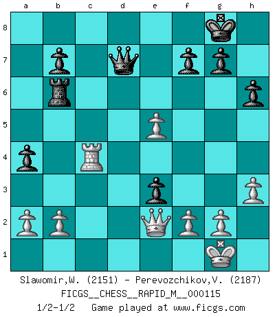 Last move : 1/2-1/2 2020 May 30 12:44:20 [Event "FICGS__CHESS__RAPID_M__000115"] [Site "FICGS"] [Date "2020.05.21"] [Round "1"] [White "Slawomir,Weglicki"] [Black "Perevozchikov,Vjacheslav"] [Result "1/2-1/2"] [WhiteElo "2151"] [BlackElo "2187"] 1.e4 e5 2.Nf3 Nc6 3.Bc4 Bc5 4.c3 Nf6 5.d3 d6 6.O-O O-O 7.Re1 a5 8.h3 h6 9.Bb5 Bd7 10.Nbd2 a4 11.Nf1 Ne7 12.Bxd7 Qxd7 13.Ng3 Bb6 14.Qc2 Ng6 15.d4 c5 16.Be3 cxd4 17.cxd4 Rfc8 18.Qe2 Ra6 19.Rac1 Rxc1 20.Rxc1 d5 21.Nxe5 Nxe5 22.dxe5 Nxe4 23.Nxe4 dxe4 24.Bxb6 Rxb6 25.Rc4 e3 1/2-1/2 Giuoco Piano Kingside Castling by player White (move 6) Kingside Castling by player Black (move 6) This chess game ended in a draw. Follow this game move after move (download)Chess is the gymnasium of the mind. (Blaise Pascal) Dass jemand wie Surab Asmaiparaschwili, der selbst Elopunkte gekauft hat , Vize-Präsident der Fide werden konnte, sagt schon einges über den Zustand dieser Organisation aus. (Joel Lautier) La señal de un Gran Maestro es su habilidad de ganar una partida rápidamente y sin dolor. (Irving Chernev) L'ordinateur a tué l'originalité. Il n'y a plus guère d'aventures sur l'échiquier. (Jacob Murray) The good fighters of old first put themselves beyond the possibility of defeat, and then waited for an opportunity of defeating the enemy. (Sun Tzu)