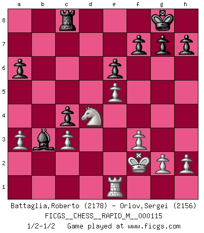 Last move : 1/2-1/2 2020 June 23 20:14:19 [Event "FICGS__CHESS__RAPID_M__000115"] [Site "FICGS"] [Date "2020.05.21"] [Round "1"] [White "Battaglia,Roberto"] [Black "Orlov,Vladimir"] [Result "1/2-1/2"] [WhiteElo "2178"] [BlackElo "2156"] 1.d4 Nf6 2.c4 e6 3.Nc3 Bb4 4.f3 d5 5.a3 Bxc3+ 6.bxc3 c5 7.cxd5 Nxd5 8.dxc5 Qa5 9.e4 Ne7 10.Be3 O-O 11.Qb3 Qc7 12.Bb5 Nec6 13.Ne2 Na5 14.Qc2 a6 15.Ba4 Rd8 16.Bb3 Nd7 17.Rd1 Rf8 18.Ba2 Nxc5 19.Nf4 b6 20.Qf2 Bd7 21.Qg3 Ncb3 22.O-O Ba4 23.Rfe1 Nc4 24.Bd4 Nxd4 25.Rxd4 b5 26.Bxc4 bxc4 27.Nh5 Qxg3 28.Nxg3 Bb3 29.e5 Rfd8 30.Ne2 Rxd4 31.Nxd4 Rc8 32.Kf2 1/2-1/2 Nimzo-Indian : Kmoch variation Kingside Castling by player Black (move 10) Kingside Castling by player White (move 22) This chess game ended in a draw. Follow this game move after move (download)Chess is in its essence a game, in its form an art, and in its execution a science. (Baron Tassilo) Schon mancher Spieler hat aufgegeben, um zu vermeiden, daß er eine Figur verliert. (Savielly Grigorievitsch Tartakower) Sin errores no puede haber brillantez. (Emanuel Lasker) 'L'échange des dames est un coup dur pour les deux adversaires...' Un journaliste lors d'une partie du match Spassky-Fischer Now you put water in a cup, it becomes the cup; You put water into a bottle it becomes the bottle; You put it in a teapot it becomes the teapot. Water can flow or it can crash. Be water, my friend. (Bruce Lee)