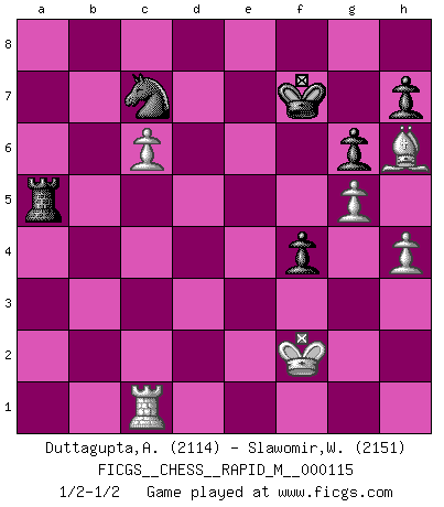 Last move : 1/2-1/2 2020 August 7 14:59:28 [Event "FICGS__CHESS__RAPID_M__000115"] [Site "FICGS"] [Date "2020.05.21"] [Round "1"] [White "Duttagupta,Aniruddha"] [Black "Slawomir,Weglicki"] [Result "1/2-1/2"] [WhiteElo "2114"] [BlackElo "2151"] 1.d4 Nf6 2.c4 c5 3.d5 b5 4.Qc2 b4 5.e4 d6 6.Bd3 g6 7.f4 Bg7 8.Nf3 O-O 9.O-O e6 10.h3 a5 11.e5 Ne8 12.Nbd2 dxe5 13.Nxe5 exd5 14.cxd5 Nd6 15.Ndc4 Nxc4 16.Bxc4 Bf5 17.Qe2 Qd6 18.g4 Bc8 19.Be3 Nd7 20.Qf2 Ba6 21.Bxa6 Rxa6 22.Rad1 Bxe5 23.fxe5 Qxe5 24.Rfe1 Rf6 25.Qg2 Qb8 26.Bg5 Rb6 27.Re7 f6 28.Bh6 Rf7 29.Re3 Nf8 30.Rde1 Qa8 31.Re7 Rd6 32.Qe4 f5 33.Qe5 Rxd5 34.Qc7 Rd7 35.Qxd7 Nxd7 36.Re8+ Qxe8 37.Rxe8+ Nf8 38.g5 f4 39.Rc8 Rf5 40.b3 c4 41.bxc4 a4 42.Rb8 b3 43.axb3 axb3 44.c5 b2 45.c6 b1Q+ 46.Rxb1 Ne6 47.Rc1 Nc7 48.Kf2 Kf7 49.h4 Ra5 1/2-1/2 Benko gambit Kingside Castling by player Black (move 8) Kingside Castling by player White (move 9) Promotion Queen by player Black (move 45) This chess game ended in a draw. Follow this game move after move (download)No price is too great for the scalp of the enemy King. (Koblentz) Im Internet Chess Club betrug mein Rating vorübergehend 3350 ELO-Punkte. (Sergej Karjakin) El Ajedrez expande y enriquece tu mente. (Saudin Robovic) La vie est comme un jeu d'échecs : nous esquissons un plan, mais celui-ci est tributaire de ce que daignent faire l'adversaire aux échecs et le destin dans la vie. (Arthur Schopenhauer) A person who never made a mistake never tried anything new. (Albert Einstein)