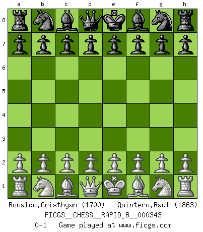 Last move : 0-1 2020 June 22 7:19:31 [Event "FICGS__CHESS__RAPID_B__000343"] [Site "FICGS"] [Date "2020.05.22"] [Round "1"] [White "Ronaldo,Cristhyan"] [Black "Quintero,Raul"] [Result "0-1"] [WhiteElo "1700"] [BlackElo "1863"] 0-1 This chess game has been lost on time (started : 2020.05.22 19:52:14) Player Black won this chess game. Follow this game move after move (download)It is always better to sacrifice your opponent's men. (Savielly Tartakower) Meine Liebe ist Schach, Schach, Schach. Ich muss jeden Tag Schach spielen, deshalb fühle ich mich so stark. (Miguel Najdorf) Cuando veas una buena jugada, trata de encontrar otra mejor. (Emanuel Lasker) Vous savez, camarade Pachman, je n'éprouve pas de plaisir à être ministre, je jouerais plutôt aux échecs comme vous, ou alors ferais une révolution au Venezuela. (Che Guevara à Ludek Pachman, 'Checkmate in Prague', 1975) Art disturbs, science reassures. (Georges Braque, Le Jour et la Nuit)