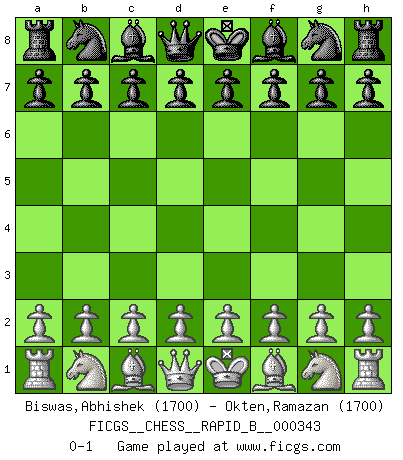Last move : 0-1 2020 June 22 7:19:31 [Event "FICGS__CHESS__RAPID_B__000343"] [Site "FICGS"] [Date "2020.05.22"] [Round "1"] [White "Biswas,Abhishek"] [Black "Okten,Ramazan"] [Result "0-1"] [WhiteElo "1700"] [BlackElo "1700"] 0-1 This chess game has been lost on time (started : 2020.05.22 19:52:14) Player Black won this chess game. Follow this game move after move (download)Without error there can be no brilliancy. (Emanuel Lasker) Ich weiss nicht was Gott gegen mich auf 1.e4 antworten würde. (Robert James Fischer) Debió haber existido una vez en que los hombres eran semidióses, de otra manera no hubiesen podido inventar el Ajedrez. (Gustav Schenk) Des combinaisons [dans le jeu d'échecs] pareilles à des mélodies. Je crois entendre pour ainsi dire la musique des coups... (Vladimir Nabokov) Gambling is the son of avarice and the father of despair. (French proverb)