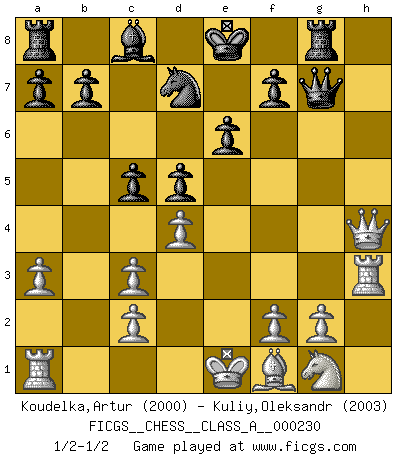 Last move : 1/2-1/2 2020 August 15 20:27:34 [Event "FICGS__CHESS__CLASS_A__000230"] [Site "FICGS"] [Date "2020.05.23"] [Round "1"] [White "Koudelka,Artur"] [Black "Kuliy,Oleksandr"] [Result "1/2-1/2"] [WhiteElo "2000"] [BlackElo "2003"] 1.e4 e6 2.d4 d5 3.Nc3 Nf6 4.Bg5 Bb4 5.e5 h6 6.exf6 hxg5 7.fxg7 Rg8 8.h4 gxh4 9.Qh5 Qf6 10.Qxh4 Qxg7 11.a3 Bxc3+ 12.bxc3 c5 13.Rh3 Nd7 1/2-1/2 French : MacCutcheon, Chigorin variation This chess game ended in a draw. Follow this game move after move (download)I don't believe in psychology. I believe in good moves. (Bobby Fischer) Wenn Schach ein enormer Dschungel ist, der seine Myriaden von Geheimnissen nicht preisgeben will, dann sind Computer die Kettensägen einer gewaltigen ökologisch unsensiblen Nutzholzfirma. (Nigel Short) Coloca el contenido de las piezas del Ajedrez en un sombrero, agitalo vigorosamente, arrojalas en un tablero desde una altura de 30 centimetros y así obtendras el estilo de Steinitz. (H. E. Bird) Donnez-moi un Cavalier en 6e et je gagnerais toutes mes parties. (Steinitz) No man has ever achieved immortality in his own life time. (Unknown)