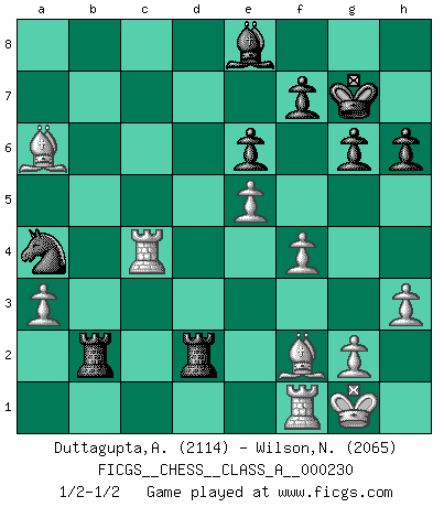 Last move : 1/2-1/2 2020 October 8 5:24:55 [Event "FICGS__CHESS__CLASS_A__000230"] [Site "FICGS"] [Date "2020.05.23"] [Round "1"] [White "Duttagupta,Aniruddha"] [Black "Wilson,Norman"] [Result "1/2-1/2"] [WhiteElo "2114"] [BlackElo "2065"] 1.e4 c6 2.d4 d5 3.f3 e6 4.Nc3 Qb6 5.a3 a6 6.Be3 Nf6 7.e5 Nfd7 8.f4 c5 9.Nf3 Nc6 10.dxc5 Bxc5 11.Na4 Qa5+ 12.b4 Qxa4 13.bxc5 O-O 14.Be2 Rd8 15.O-O d4 16.Nxd4 Nxc5 17.c3 Bd7 18.Qb1 h6 19.Nxc6 Qxc6 20.Bf3 Qc7 21.Qb4 Na4 22.Qxb7 Qxc3 23.Rfe1 Bb5 24.Bh5 Be8 25.Rac1 Qd3 26.Bf2 Rab8 27.Qc7 Qd7 28.Qxd7 Rxd7 29.Be2 Rd2 30.Bxa6 R8b2 31.Rf1 Kh7 32.h3 g6 33.Rc4 Kg7 1/2-1/2 Caro-Kann : Tartakower (fantasy) variation Kingside Castling by player Black (move 13) Kingside Castling by player White (move 15) This chess game ended in a draw. Follow this game move after move (download)It began to feel as though you were playing against Chess itself. - On playing against Robert Fischer. (Walter Shipman) Weshalb minderdergeübte Spieler mit g2-g4 beginnen? Die betreffenden sind unschlüssig, ob sie nun rechts (h4) oder links (f4) beginnen sollen, und in ihrer Ratlosigkeit entschliessen sie sich nach guter Bürgerart dazu, den goldenen Mittelweg zu wählen. (Aaron Nimzowitsch) Peones: ellos son el alma de esta partida, solos forman el ataque y la defensa. (Philidor) Psychologiquement, tu dois avoir confiance en toi même, mais cette confiance doit être basée sur des faits. (Robert Fischer) Do you know these so called Volunteers don't even get paid! (Simpsons)