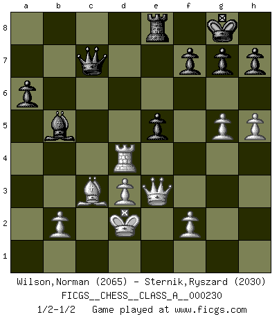 Last move : 1/2-1/2 2020 June 25 20:18:27 [Event "FICGS__CHESS__CLASS_A__000230"] [Site "FICGS"] [Date "2020.05.23"] [Round "1"] [White "Wilson,Norman"] [Black "Sternik,Ryszard"] [Result "1/2-1/2"] [WhiteElo "2065"] [BlackElo "2030"] 1.e4 c5 2.Nf3 d6 3.d4 cxd4 4.Nxd4 Nf6 5.Nc3 a6 6.h3 e6 7.g4 d5 8.exd5 Nxd5 9.Nde2 Bb4 10.a3 Bxc3+ 11.Nxc3 O-O 12.Qd3 Nxc3 13.Qxc3 b5 14.Rg1 Bb7 15.Bd2 Bd5 16.O-O-O Nc6 17.Qc5 Rc8 18.Bc3 Qg5+ 19.Qe3 Qe7 20.Kb1 Rfd8 21.g5 Ba2+ 22.Kc1 Rxd1+ 23.Kxd1 Bd5 24.Bd3 Qd6 25.Kc1 b4 26.axb4 Nxb4 27.Kd2 Bc4 28.Rg4 Nxd3 29.cxd3 Bb5 30.Rd4 Qc7 31.h4 Re8 32.h5 e5 1/2-1/2 Sicilian : Najdorf, Adams attack Kingside Castling by player Black (move 11) Queenside Castling by player White (move 16) This chess game ended in a draw. Follow this game move after move (download)The most important feature of the Chess position is the activity of the pieces. This is absolutely fundamental in all phases of the game: Opening, Middlegame and especially Endgame. The primary constraint on a piece's activity is the Pawn structure. (Michael Stean) Wie kann ich Remis annehmen? Ich weiß ja gar nicht, wie ich stehe! (Fritz Sämisch) Preferería tener un Peón que un dedo. (Reuben Fine) Dans le domaine de la peinture, de la gravure et de la sculpture, dès la première décennie de notre siècle, les artistes abandonnent la représentation de la partie d'échecs pour se concentrer sur les pièces, sur les échiquiers et sur toutes les variations auxquelles les unes et les autres peuvent donner lieu. On passe en quelque sorte d'un thème social à un thème musical (au sens de la musica médiévale, c'est-à-dire d'une notion qui inclue le rythme, l'harmonie, la construction et la déconstruction, etc.). Graphiquement et picturalement, l'échiquier apparaît comme une structure ouverte, dynamique, d'une richesse infinie, autorisant toutes les combinatoires et débouchant sur des mouvements et des rythmes de nature exponentielle. (Michel Pastoureau) When it is a question of money, everybody is of the same religion. (Voltaire)