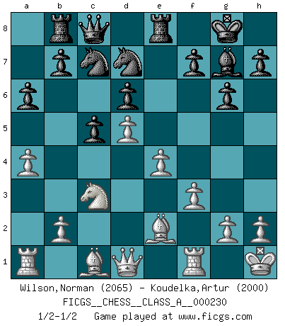 Last move : 1/2-1/2 2020 August 18 10:11:54 [Event "FICGS__CHESS__CLASS_A__000230"] [Site "FICGS"] [Date "2020.05.23"] [Round "1"] [White "Wilson,Norman"] [Black "Koudelka,Artur"] [Result "1/2-1/2"] [WhiteElo "2065"] [BlackElo "2000"] 1.d4 Nf6 2.Nf3 g6 3.e3 Bg7 4.Be2 O-O 5.c4 c5 6.d5 e6 7.Nc3 exd5 8.cxd5 d6 9.O-O Na6 10.e4 Re8 11.Nd2 Nc7 12.a4 Rb8 13.f3 Nd7 14.Kh1 a6 15.Nc4 Ne5 16.Nb6 Nd7 17.Nxc8 Qxc8 1/2-1/2 King's Indian : East Indian defense Kingside Castling by player Black (move 4) Kingside Castling by player White (move 9) This chess game ended in a draw. Follow this game move after move (download)All my games are real. (Bobby Fischer) Wenn ich Weiß habe gewinne ich weil ich Weiß habe, wenn ich Schwarz habe gewinne ich weil ich Bogoljubov bin. (Efim Bogoljubov) Fischer sacrificó virtualmente todo lo que la mayoría de nosotros los 'debiles' (término que él usa) valoramos, respetamos y apreciamos por el amor de un astuto, a menudo hermoso tablero de juego, por el privilegio ambivalente de ser su mas grande maestro. (Paul Kollar) On entre au jeu d'Echecs comme on entre en Religion. Pour le joueur d'Echecs, la partie d'Echecs c'est l'office, la messe, le défilé du 1er Mai, le dépôt de gerbe au Monument aux Morts. C'est un drame sacré. (Michel Roos) Don't be irreplaceable, if you can't be replaced, you can't be promoted. (Dan Rotaru)