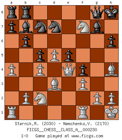 Last move : 1-0 2020 August 5 7:47:36 [Event "FICGS__CHESS__CLASS_A__000230"] [Site "FICGS"] [Date "2020.05.23"] [Round "1"] [White "Sternik,Ryszard"] [Black "Nemchenko,Valery"] [Result "1-0"] [WhiteElo "2030"] [BlackElo "2170"] 1.e4 c6 2.d4 g6 3.c4 Bg7 4.Nc3 d6 5.Nf3 Nf6 6.Be2 O-O 7.O-O Nbd7 8.Bg5 h6 9.Be3 e5 10.d5 c5 11.Qc1 Kh7 12.Ne1 b6 13.f3 Bb7 14.Qc2 Ne8 15.Qd2 Nc7 16.Nc2 f5 17.exf5 gxf5 18.a4 Na6 19.Nb5 Qf6 20.Kh1 f4 21.Bd3+ Kh8 22.Bf2 Rfc8 23.Qe1 Nc7 24.Bh4 Qf8 25.Qe4 Qg8 26.Nxd6 Rcb8 27.Nf7+ 1-0 Caro-Kann defense Kingside Castling by player Black (move 6) Kingside Castling by player White (move 7) Player White won this chess game. Follow this game move after move (download)There are two classes of men; those who are content to yield to circumstances and who play whist; those who aim to control circumstances, and who play Chess. (Mortimer Collins) Fischer machte Schach einfach zu einer aufregenden Sache, wann immer er sich ans Brett setzte. (Raymond Keene) Entre mas años cumplo, mas valoro los Peones. (Keres) Ce n'est pas pour s'amuser qu'il joue aux échecs : il célèbre un culte. (Vladimir Nabokov) Your best chance to get a Royal Flush in a casino is in the bathroom. (Anonymous)