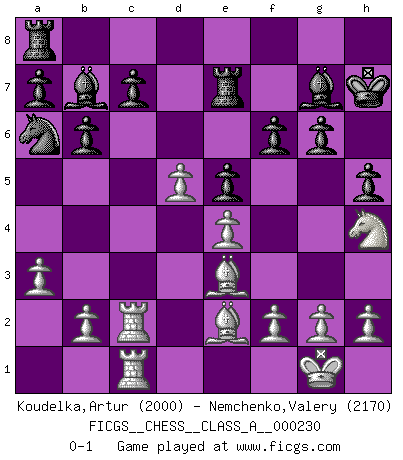 Last move : 0-1 2020 September 6 13:14:28 [Event "FICGS__CHESS__CLASS_A__000230"] [Site "FICGS"] [Date "2020.05.23"] [Round "1"] [White "Koudelka,Artur"] [Black "Nemchenko,Valery"] [Result "0-1"] [WhiteElo "2000"] [BlackElo "2170"] 1.d4 Nf6 2.c4 g6 3.Nc3 Bg7 4.e4 d6 5.Nf3 O-O 6.Be2 e5 7.dxe5 dxe5 8.Qxd8 Rxd8 9.Bg5 Re8 10.Nd5 Nxd5 11.cxd5 h6 12.Be3 b6 13.Rc1 Na6 14.O-O Re7 15.a3 Bb7 16.Rc2 f6 17.Rfc1 h5 18.Nh4 Kh7 0-1 This chess game has been lost on time (started : 2020.05.23 3:21:36) King's Indian : Andersson variation Kingside Castling by player Black (move 5) Kingside Castling by player White (move 14) Player Black won this chess game. Follow this game move after move (download)We like to think. (Gary Kasparov) Schach ist das schnellste Spiel der Welt, weil man in jeder Sekunde Tausende von Gedanken ordnen muß. (Albert Einstein) El Ajedrez es tortura mental. (Garry Kasparov) C'est une question de caractère, Beaucoup de gens perdent leur motivation très vite. D'autres, ils sont rares, peuvent la conserver très longtemps. J'aime les échecs, encore aujourd'hui je suis heureux d'analyser des parties. J'aime toujours gagner, je déteste encore perdre. Bien jouer est important pour mon intégrité intellectuelle et morale. Et puis les échecs vivent en ce moment une période historique grâce à Internet. Ils se développent dans les systèmes éducatifs à travers le monde. Ils sortent de leur ghetto, et c'est mon rôle de mener à bien cette révolution. (Gary Kasparov) Industry executives and analysts often mistakenly talk about strategy as if it were some kind of chess match. But in chess, you have just two opponents, each with identical resources, and with luck playing a minimal role. The real world is much more like a poker game, with multiple players trying to make the best of whatever hand fortune has dealt them. In our industry, Bill Gates owns the table until someone proves otherwise. (David Moschella, 'Computerworld')