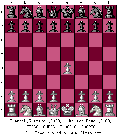 Last move : 1-0 2020 July 3 2:21:1 [Event "FICGS__CHESS__CLASS_A__000230"] [Site "FICGS"] [Date "2020.05.23"] [Round "1"] [White "Sternik,Ryszard"] [Black "Wilson,Fred"] [Result "1-0"] [WhiteElo "2030"] [BlackElo "2000"] 1.e4 1-0 This chess game has been lost on time (started : 2020.05.23 3:21:36) King's pawn Opening Player White won this chess game. Follow this game move after move (download)What would Chess be without silly mistakes ? (Kurt Richter) Die jungen Leute sollen verstehen, dass sie noch etwas von mir lernen können und müssen. (Viktor Kortschnoi) En manos de Fischer's, una diminuta ventaja teórica es tan buena como tener una Reina de ventaja. (Isaac Kashdan) Vous n'êtes pas toujours obligé de jouer le meilleur coup. Un coup doit être actif, entreprenant, correct et beau ! (David Bronstein) Secret operations are essential in war; upon them the army relies to make its every move. (Sun Tzu)