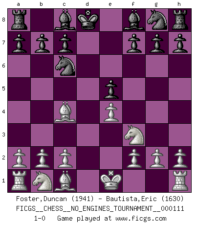 Last move : 1-0 2020 July 7 5:41:40 [Event "FICGS__CHESS__NO_ENGINES_TOURNAMENT__000111"] [Site "FICGS"] [Date "2020.05.24"] [Round "1"] [White "Foster,Duncan"] [Black "Bautista,Eric"] [Result "1-0"] [WhiteElo "1941"] [BlackElo "1630"] 1.e4 e5 2.Nf3 Nc6 3.d4 d6 4.dxe5 dxe5 5.Qxd8+ Kxd8 6.Bc4 1-0 This chess game has been lost on time (started : 2020.05.24 20:21:23) Scotch Opening Player White won this chess game. Follow this game move after move (download)Some sacrifices are sound; the rest are mine. (Mikhail Tal) Was ist der Unterschied zwischen einem Strassenarbeiter und einem Schachspieler? --Der Schachspieler bewegt sich ab und zu. (Anonymous) El Ajedrez por encima de todo... ¡es una pelea!. (Emanuel Lasker) RxDa4 pat (...) The modern world has divided itself into Conservatives and Progressives. The business of Progressives is to go on making mistakes. The business of the Conservatives is to prevent the mistakes from being corrected. (G.K. Chesterton)