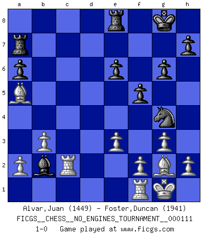 Last move : 1-0 2020 August 3 17:35:0 [Event "FICGS__CHESS__NO_ENGINES_TOURNAMENT__000111"] [Site "FICGS"] [Date "2020.05.24"] [Round "1"] [White "Alvar,Juan"] [Black "Foster,Duncan"] [Result "1-0"] [WhiteElo "1449"] [BlackElo "1941"] 1.d4 f5 2.c4 Nf6 3.Nc3 d6 4.g3 g6 5.Bg2 Bg7 6.Nf3 O-O 7.O-O c6 8.Re1 Be6 9.d5 Bf7 10.Ng5 Nbd7 11.Nxf7 Rxf7 12.dxc6 bxc6 13.Bxc6 Rb8 14.Bg2 Qa5 15.Qc2 Qb4 16.Be3 a6 17.b3 Ng4 18.Bd2 Qc5 19.Rf1 Re8 20.Rac1 Bd4 21.e3 Bg7 22.Na4 Qa7 23.c5 dxc5 24.Nxc5 Nxc5 25.Qxc5 e6 26.Qxa7 Rxa7 27.Ba5 Bb2 28.Rc2 1-0 Dutch with c4 & Nc3 Kingside Castling by player Black (move 6) Kingside Castling by player White (move 7) Player White won this chess game. Follow this game move after move (download)One bad move nullifies forty good ones. (Horowitz) Frage des Reporters: -Welche besonderen Umstände rechtfertigen das Anhalten der Uhren während einer Turnierpartie? Antwort: -Einen Fotographen zu strangulieren. (Siegbert Tarrasch) Cada Peón es una Reina en potencia. (James Mason) La tactique, c'est ce que vous faites quand il y a quelque chose à faire; la stratégie, c'est ce que vous faites quand il n'y a rien à faire. (Savielli Tartacower) At work, the authority of a person is inversely proportional to the number of pens that person is carrying. (Dan Rotaru)