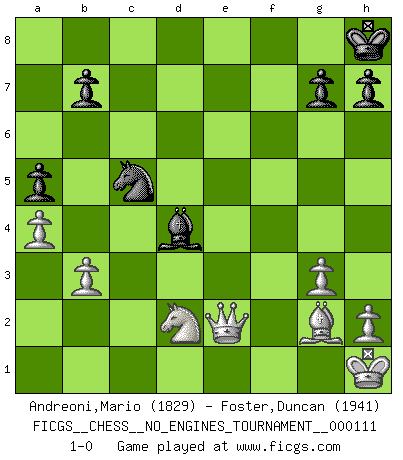 Last move : 1-0 2020 July 3 19:41:15 [Event "FICGS__CHESS__NO_ENGINES_TOURNAMENT__000111"] [Site "FICGS"] [Date "2020.05.24"] [Round "1"] [White "Andreoni,Mario"] [Black "Foster,Duncan"] [Result "1-0"] [WhiteElo "1829"] [BlackElo "1941"] 1.e4 c6 2.d3 d5 3.Nd2 e5 4.Ngf3 Bd6 5.g3 f5 6.Bg2 Nf6 7.O-O O-O 8.c3 fxe4 9.dxe4 a5 10.a4 Bg4 11.Qb3 Qe7 12.exd5 cxd5 13.c4 dxc4 14.Nxc4 Bb4 15.Nfxe5 Be6 16.Be3 Na6 17.Rac1 Nd5 18.Bd4 Rad8 19.Rfd1 Nc5 20.Qa2 Qe8 21.b3 Qh5 22.f3 Nc3 23.Bxc3 Rxd1+ 24.Rxd1 Bxc3 25.Ng4 Bxg4 26.fxg4 Qxg4 27.Qc2 Bd4+ 28.Kh1 Rf2 29.Rd2 Rxd2 30.Nxd2 Qe2 31.Qc4+ Kh8 32.Qxe2 1-0 Caro-Kann : Closed (Breyer) variation Kingside Castling by player White (move 7) Kingside Castling by player Black (move 7) Player White won this chess game. Follow this game move after move (download)Via the squares on the chessboard, the Indians explain the movement of time and the age, the higher influences which control the world and the ties which link Chess with the human soul. (Al-Masudi) Ich hatte Zahnschmerzen im ersten Spiel. In der zweiten Partie tat mir der Kopf weh. In der dritten war es eine Rheuma-Attacke und während der vierten fühlte ich mich nicht gut. Und in der fünften? Nun, man muss doch nicht jedes Spiel gewinnen, oder? (Savielly Grigorievitsch Tartakower) Las combinaciones han sido siempre el aspecto más intrigante del Ajedrez. Los Maestros las buscan, el público las aplauden, los críticos las alaban. La razón se debe a que las combinaciones hacen posible que el Ajedrez sea más que un ejercicio matemático con una carencia de vida. Ellas son la poesía del juego, son del Ajedrez lo que la melodía es de la música. Ellas representan el triunfo de la mente sobre la materia. (Reuben Fine) Le génie consiste à savoir transgresser les règles au moment opportun. (Teichmann) Gambling is the son of avarice and the father of despair. (French proverb)