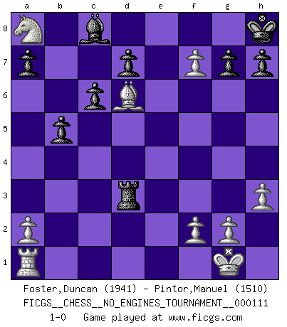 Last move : 1-0 2020 June 30 17:28:7 [Event "FICGS__CHESS__NO_ENGINES_TOURNAMENT__000111"] [Site "FICGS"] [Date "2020.05.24"] [Round "1"] [White "Foster,Duncan"] [Black "Pintor,Manuel"] [Result "1-0"] [WhiteElo "1941"] [BlackElo "1510"] 1.e4 e5 2.Nf3 Nc6 3.d4 exd4 4.Bc4 Qf6 5.c3 dxc3 6.Nxc3 Bb4 7.Qb3 Bxc3+ 8.bxc3 Na5 9.Qb4 Nxc4 10.Qxc4 c6 11.O-O Ne7 12.Rd1 O-O 13.e5 Qg6 14.Ba3 Re8 15.Bd6 Nd5 16.Rd3 b5 17.Qd4 Qf5 18.Nh4 Qf4 19.Qxf4 Nxf4 20.Re3 Re6 21.Nf5 Nd5 22.Rg3 Rg6 23.Rf3 Rg4 24.h3 Rf4 25.Ne7+ Kh8 26.Nxd5 Rxf3 27.Nc7 Rxc3 28.Nxa8 f6 29.exf6 Rd3 30.f7 1-0 Scotch gambit Kingside Castling by player White (move 11) Kingside Castling by player Black (move 12) Player White won this chess game. Follow this game move after move (download)Chess is above all, a fight ! (Emanuel Lasker) Wenn Spassky eine Figur opfert kannst du genauso gut aufgeben. Aber wenn Tal eine Figur opfert, spiel weiter. Er könnte noch eine weitere opfern, und dann ... wer weiß? (Miguel Najdorf) Todavía soy una víctima del Ajedrez. Tiene toda la belleza del arte y mucho mas. No puede ser comercializado. El Ajedrez es mas puro que el arte en su posición social. (Marcel Duchamp) Même un GMI sait rarement calculer sur plus de cinq coups une attaque à sacrifices. (Rudolf Spielmann) A good book on your shelf is a friend that turns its back on you and remains a friend. (Author unknown)