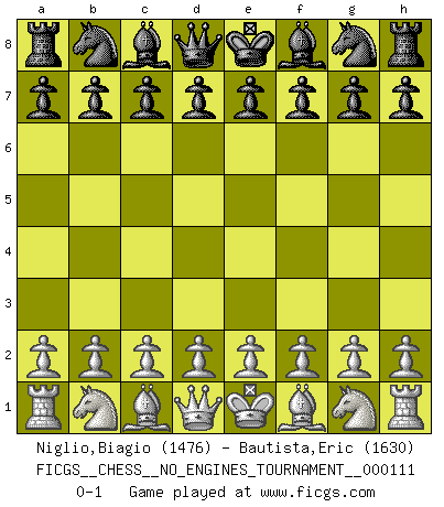 Last move : 0-1 2020 July 4 3:18:12 [Event "FICGS__CHESS__NO_ENGINES_TOURNAMENT__000111"] [Site "FICGS"] [Date "2020.05.24"] [Round "1"] [White "Niglio,Biagio"] [Black "Bautista,Eric"] [Result "0-1"] [WhiteElo "1476"] [BlackElo "1630"] 0-1 This chess game has been lost on time (started : 2020.05.24 20:21:23) Player Black won this chess game. Follow this game move after move (download)Fischer is the strongest player in the world. In fact, the strongest player who ever lived. (Larry Evans) Wenn sie aufgeben, dann danke ich Ihnen für das Spiel (Eventualzug beim Fernschach). (Anonymous) La enorme capacidad mental, en la que sin ella no puede un jugador de Ajedrez existir, es demasiado requerida por el Ajedrez al grado de que nunca podrá liberar su mente de este juego. (Albert Einstein) Les échecs sont plus proches de l'art de l'assassinat que de l'art de la guerre. (Arturo Perez-Reverte) For to win one hundred victories in one hundred battles is not the acme of skill. To subdue the enemy without fighting is the acme of skill. (Sun Tzu)