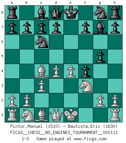 Last move : 1-0 2020 July 5 4:10:46 [Event "FICGS__CHESS__NO_ENGINES_TOURNAMENT__000111"] [Site "FICGS"] [Date "2020.05.24"] [Round "1"] [White "Pintor,Manuel"] [Black "Bautista,Eric"] [Result "1-0"] [WhiteElo "1510"] [BlackElo "1630"] 1.e4 e5 2.f4 exf4 3.Nf3 g5 4.Bc4 Nc6 5.d4 Bg7 6.c3 1-0 This chess game has been lost on time (started : 2020.05.24 20:21:23) KGA : Blachly gambit Player White won this chess game. Follow this game move after move (download)When your house is on fire, you can't be bothered with the neighbors. Or, as we say in Chess, if your King is under attack you don't worry about losing a Pawn on the Queen's side. (Gary Kasparov) Kritik überlasse ich den Spießern. Ich zeige nichts, wofür ich mich schämen muss. (Alexandra Kosteniuk) El Ajedrez es un regaderazo frío para la mente. (Sir John Simon) On a dit que l'homme se distingue de l'animal par le fait qu'il achète plus de livres qu'il ne peut en lire. Je voudrais suggérer qu'inclure à la liste des livres quelques livres d'échecs rendrait la distinction manifeste. (Edward Lasker) To steal ideas from one person is plagiarism. To steal from many is research. (Unknown)