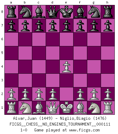 Last move : 1-0 2020 July 5 4:10:46 [Event "FICGS__CHESS__NO_ENGINES_TOURNAMENT__000111"] [Site "FICGS"] [Date "2020.05.24"] [Round "1"] [White "Alvar,Juan"] [Black "Niglio,Biagio"] [Result "1-0"] [WhiteElo "1449"] [BlackElo "1476"] 1.e4 1-0 This chess game has been lost on time (started : 2020.05.24 20:21:23) King's pawn Opening Player White won this chess game. Follow this game move after move (download)I know people who have all the will in the world, but still can't play good Chess. (Bobby Fischer) In Buenos Aires ist es nicht mein vorrangiges Ziel ein starkes Turnier zu organisieren, sondern ein Turnier für Gentlemen. Ich würde nie Kamsky einladen. Ich mag keine Probleme. (Miguel Najdorf) No nos podemos resistir a la fascinación de un sacrificio ya que la pasión por los sacrificios es parte de la naturaleza de un jugador de Ajedrez. (Rudolf Spielman) Aux échecs, l'amour-propre est satisfait quand on remporte la victoire, mais il n'y a pas de honte à être battu. (Benjamin Franklin) You think that education is too expensive ? Try ignorance. (Derek Bok)