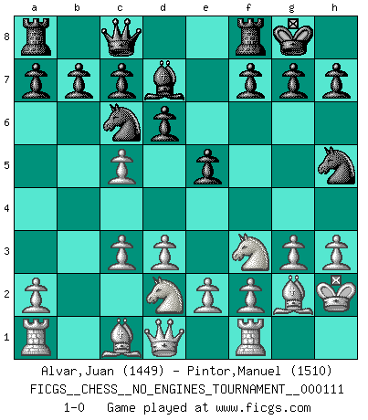 Last move : 1-0 2020 June 19 0:53:48 [Event "FICGS__CHESS__NO_ENGINES_TOURNAMENT__000111"] [Site "FICGS"] [Date "2020.05.24"] [Round "1"] [White "Alvar,Juan"] [Black "Pintor,Manuel"] [Result "1-0"] [WhiteElo "1449"] [BlackElo "1510"] 1.Nf3 Nc6 2.g3 e5 3.d3 Bc5 4.Bg2 d6 5.O-O Bg4 6.Nbd2 Nf6 7.h3 Bd7 8.c3 O-O 9.b4 Nh5 10.bxc5 Qc8 11.Kh2 1-0 Reti Opening Kingside Castling by player White (move 5) Kingside Castling by player Black (move 8) Player White won this chess game. Follow this game move after move (download)It is peculiar but a fact nevertheless, that gamblers in chess always have enthusiastic followers. (Botvinnik) Smyslow ist ein Beweis dafür, dass ich noch zehn Jahre spielen kann! [der 75 jährige über den 85 jährigen] (Viktor Kortschnoi) El Ajedrez detiene a su maestro dentro de sus propios vínculos, encadenando la mente y el cerebro, por lo que la libertad interior del mas fuerte debe sufrir. (Albert Einstein) Si je n'étais pas joueur d'échecs, je serais le meilleur dans quelque chose d'autre. (Anatoli Karpov) Internet: Absolute communication, absolute isolation. (Paul Carvel)