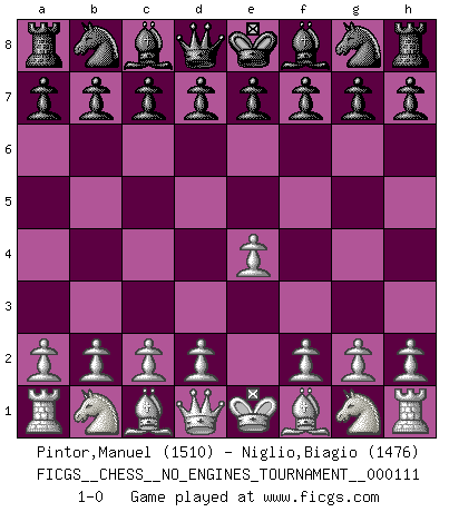 Last move : 1-0 2020 July 4 3:18:12 [Event "FICGS__CHESS__NO_ENGINES_TOURNAMENT__000111"] [Site "FICGS"] [Date "2020.05.24"] [Round "1"] [White "Pintor,Manuel"] [Black "Niglio,Biagio"] [Result "1-0"] [WhiteElo "1510"] [BlackElo "1476"] 1.e4 1-0 This chess game has been lost on time (started : 2020.05.24 20:21:23) King's pawn Opening Player White won this chess game. Follow this game move after move (download)Adequate compensation for a sacrifice is having a sound combination leading to a winning position; adequate compensation for a blunder is having your opponent snatch defeat from the jaws of victory. (Bruce A. Moon) Schach ist gnadenlos. Du mußt bereit sein zu töten. (Nigel Short) Cada Peón es una Reina en potencia. (James Mason) Les pièces de l'échiquier étaient impitoyables. Elles le retenaient, elles l'absorbaient. Il y avait de l'horreur en cela, mais aussi une harmonie unique. Car, qu'y a-t-il dans le monde, à part les échecs ? (V. Nabokov) Thus, what is of supreme importance in war is to attack the enemy's strategy. (Sun Tzu)