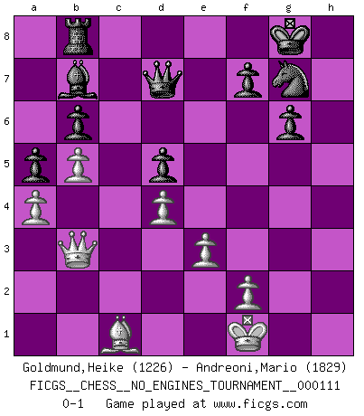 Last move : 0-1 2020 June 26 11:37:57 [Event "FICGS__CHESS__NO_ENGINES_TOURNAMENT__000111"] [Site "FICGS"] [Date "2020.05.24"] [Round "1"] [White "Goldmund,Heike"] [Black "Andreoni,Mario"] [Result "0-1"] [WhiteElo "1226"] [BlackElo "1829"] 1.b4 a5 2.b5 b6 3.c4 e5 4.Bb2 d6 5.e3 Nf6 6.Nf3 Bb7 7.Be2 Be7 8.O-O Nbd7 9.d3 O-O 10.Nbd2 Ne8 11.Qc2 c6 12.Rfc1 g6 13.a4 Ng7 14.d4 Bf6 15.Ne4 Qe7 16.Nxf6+ Qxf6 17.Qe4 d5 18.cxd5 cxd5 19.Qd3 e4 20.Qb3 exf3 21.Bxf3 Qf5 22.Rc7 Rab8 23.Rac1 Rfc8 24.h3 h5 25.g4 Qxf3 26.Rxd7 Rxc1+ 27.Bxc1 hxg4 28.hxg4 Qxg4+ 29.Kf1 Qxd7 0-1 Polish (Sokolsky) opening Kingside Castling by player White (move 8) Kingside Castling by player Black (move 9) Player Black won this chess game. Follow this game move after move (download)Chess is mental torture. (Garry Kasparov) Ohne Leiden bildet sich kein Charakter. (Ernst Freiherr von Feuchtersleben) Bendita sea la memoria de aquel que dio al mundo este juego inmortal. (A. G. Gardiner) D'abord les bases : Jouez et étudiez, puis étudiez et jouez, ensuite jouez et étudiez, puis étudiez et jouez. Deuxièmement : Donnez toujours le meilleur de vous-même ! (Ken Smith) Don't be irreplaceable, if you can't be replaced, you can't be promoted. (Dan Rotaru)