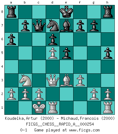 Last move : 0-1 2020 July 12 3:21:37 [Event "FICGS__CHESS__RAPID_A__000254"] [Site "FICGS"] [Date "2020.05.24"] [Round "1"] [White "Koudelka,Artur"] [Black "Michaud,Francois"] [Result "0-1"] [WhiteElo "2000"] [BlackElo "2000"] 1.e4 c5 2.Nf3 d6 3.d4 cxd4 4.Nxd4 Nf6 5.Nc3 a6 6.Be3 e5 7.Nb3 Be6 8.f3 Be7 9.Qd2 Qc7 10.O-O-O h5 11.Nd5 Nxd5 12.exd5 Bf5 13.Bd3 Bxd3 14.Qxd3 Nd7 0-1 This chess game has been lost on time (started : 2020.05.24 20:58:45) Sicilian : Najdorf, Byrne (English) attack Queenside Castling by player White (move 10) Player Black won this chess game. Follow this game move after move (download)Chess, like love, is infectious at any age. (Flohr) Mein erstes Ziel war nicht, die Partie zu gewinnen, sondern eine Figur zu opfern. -- der junge (Wilhelm Steinitz) Fischer era un maestro de claridad y un Rey del posicionamiento astuto. Sus oponentes podían ver hacia donde se dirigía pero eran impotentes para detenerlo. (Bruce Pandolfini) On croit qu'il y a plus de mauvais joueurs que de bons joueurs, c'est faux : Il y a autant de joueurs qui gagnent que de joueurs qui perdent. (Philippe Geluck) Philosophers use a language that is already deformed as though by shoes that are too tight. (Ludwig Wittgenstein)