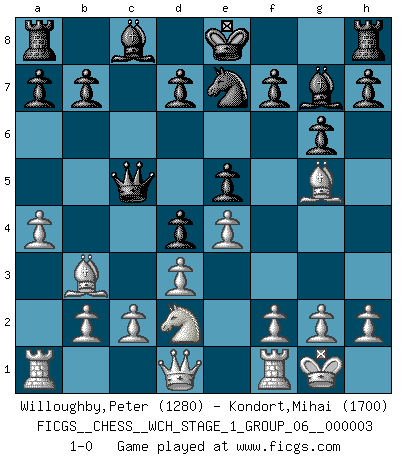 Last move : 1-0 2007 September 16 20:45:6 [Event "FICGS__CHESS__WCH_STAGE_1_GROUP_06__000003"] [Site "FICGS"] [Date "2007.07.11"] [Round "1"] [White "Willoughby,Peter"] [Black "Kondort,Mihai"] [Result "1-0"] [WhiteElo "1280"] [BlackElo "1700"] 1.e4 c5 2.Nf3 Nc6 3.Bb5 Nd4 4.Nxd4 cxd4 5.O-O g6 6.d3 Bg7 7.Bf4 Qb6 8.Bc4 e6 9.Bb3 Ne7 10.Nd2 e5 11.Bg5 Qc5 12.a4 1-0 This chess game has been lost on time (started : 2007.07.11 16:57:46) Sicilian : Nimzovich-Rossolimo attack (without ...d6) Kingside Castling by player White (move 5) Player White won this chess game. Follow this game move after move (download)The blunders are all there on the board, waiting to be made. (Savielly Tartakover) Matt entspricht nicht immer den Tatsachen. (Savielly Grigorievitsch Tartakower) Una victoria por una combinación errónea, aunque sea espectacular, me llena de horror artístico. (Wilhelm Steinitz) Dieu déplace le joueur, et celui-ci la pièce. Quel Dieu derrière Dieu commence donc la trame ? Arturo Perez-Reverte (prix de littérature policière 1993). Perhaps chess is the wrong game for the times (The Chess Master and the Computer, by Garry Kasparov - 2010)