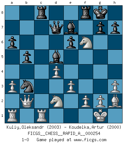 Last move : 1-0 2020 July 28 0:47:19 [Event "FICGS__CHESS__RAPID_A__000254"] [Site "FICGS"] [Date "2020.05.24"] [Round "1"] [White "Kuliy,Oleksandr"] [Black "Koudelka,Artur"] [Result "1-0"] [WhiteElo "2003"] [BlackElo "2000"] 1.d4 d5 2.c4 c6 3.cxd5 cxd5 4.Bf4 Nc6 5.e3 Nf6 6.Nc3 Bf5 7.Qb3 Na5 8.Qa4+ Bd7 9.Qc2 e6 10.Nf3 Rc8 11.Bd3 Be7 12.h3 O-O 13.O-O b5 14.a3 a6 15.Ne5 Bc6 16.Rfc1 Bb7 17.b3 Ne4 18.Qb2 f6 19.Nf3 Qe8 20.Bh2 Qd7 21.Bxe4 dxe4 22.Nd2 Bd5 23.Ncxe4 Nxb3 24.Nxf6+ 1-0 QGD Slav defense : Exchange variation Kingside Castling by player Black (move 12) Kingside Castling by player White (move 13) Player White won this chess game. Follow this game move after move (download)The tactician must know what to do whenever something needs doing; the strategist must know what to do when nothing needs doing. (Savielly Tartakover) Fischer machte Schach einfach zu einer aufregenden Sache, wann immer er sich ans Brett setzte. (Raymond Keene) Dios mío, Bobby Fischer juega tan simple. (Alexei Suetin) Je ne suis pas le dernier à jouer lâchement des coups douteux pendant le zeïtnot de l'adversaire pour l'achever: en effet les coups qui font le plus peur sont ceux que l'on ne comprend pas. Je me fais souvent peur quand je joue. (Un professeur anonyme) Memory is a crazy woman that hoards colored rags and throws away food. (Austin O'Malley)