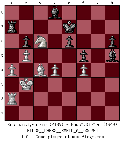 Last move : 1-0 2020 August 27 16:2:4 [Event "FICGS__CHESS__RAPID_A__000254"] [Site "FICGS"] [Date "2020.05.24"] [Round "1"] [White "Koslowski,Volker"] [Black "Faust,Dieter"] [Result "1-0"] [WhiteElo "2139"] [BlackElo "1949"] 1.e4 e5 2.Nf3 Nc6 3.Bb5 Nf6 4.O-O Nxe4 5.Re1 Nd6 6.Nxe5 Be7 7.Bf1 Nxe5 8.Rxe5 O-O 9.d4 Bf6 10.Re1 Re8 11.c3 Rxe1 12.Qxe1 Qe8 13.Qd1 b6 14.Bf4 Qe6 15.Na3 Bb7 16.Qe2 Re8 17.Qxe6 dxe6 18.Bxd6 cxd6 19.Nb5 Be7 20.Nxa7 Ra8 21.Nb5 Bc6 22.Nc7 Ra5 23.Na6 g6 24.Nb4 Bd7 25.g3 d5 26.f4 h6 27.Nd3 Kg7 28.Ne5 Be8 29.a3 f6 30.Nd3 Bd6 31.Re1 Bd7 32.Kf2 Kg8 33.h4 Kf7 34.Bg2 Bf8 35.h5 g5 36.Ra1 Bb5 37.Nb4 gxf4 38.gxf4 f5 39.Bf1 Be8 40.Nd3 Bd6 41.Ne5+ Kf6 42.Be2 Ra7 43.Bd1 Rg7 44.a4 Ra7 45.b4 Bc7 46.Ke3 Bd8 47.Kd2 Bc7 48.Kc1 Bd8 49.Kb2 Bc7 50.Kb3 Bd6 51.Bf3 Bb5 52.Ra3 Be8 53.Ra2 Ke7 54.Be2 Bc7 55.b5 Bd8 56.c4 dxc4+ 57.Bxc4 Bxh5 58.Nc6+ 1-0 Ruy Lopez : Berlin defense, Open variation Kingside Castling by player White (move 4) Kingside Castling by player Black (move 8) Player White won this chess game. Follow this game move after move (download)Alekhine is a poet who creates a work of art out of something that would hardly inspire another man to send home a picture post card. (Max Euwe) Um dein Spiel zu verbessern musst du zuallererst das Endspiel studieren, denn diese kann unabhängig studiert werden. Die Eröffnung und das Mittelspiel müssen immer in Bezug gesetzt werden zum Endspiel. (José Raúl Capablanca) El Ajedrez lo es todo: arte, ciencia y deporte. (Anatoly Karpov) Dieu déplace le joueur, et celui-ci la pièce. Quel Dieu derrière Dieu commence donc la trame ? Arturo Perez-Reverte (prix de littérature policière 1993). The best weapon against an enemy is another enemy. (Friedrich Nietzsche)