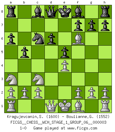 Last move : 1-0 2007 August 8 8:57:40 [Event "FICGS__CHESS__WCH_STAGE_1_GROUP_06__000003"] [Site "FICGS"] [Date "2007.07.11"] [Round "1"] [White "Kragujevcanin,Stole"] [Black "Boulianne,Gabriel"] [Result "1-0"] [WhiteElo "1600"] [BlackElo "1552"] 1.e4 c5 2.Nf3 Nc6 3.d4 cxd4 4.Nxd4 Nf6 5.Nc3 e5 6.Ndb5 d6 7.Bg5 a6 8.Na3 b5 9.Bxf6 1-0 Sicilian : Pelikan (Lasker/Sveshnikov) variation Player White won this chess game. Follow this game move after move (download)The enormous mental resilience, without which no Chess player can exist, was so much taken up by Chess that he could never free his mind of this game. (Albert Einstein) Dieses schreckliche Gefühl, dass ich gegen eine Maschine spielte, die niemals Fehler macht, zerschmetterte meinen Widerstand. (Mark Taimanov) Fischer era un maestro de claridad y un Rey del posicionamiento astuto. Sus oponentes podían ver hacia donde se dirigía pero eran impotentes para detenerlo. (Bruce Pandolfini) Votre seul travail dans les ouvertures est d'obtenir un milieu de partie jouable. (Lajos Portish) Mac users swear by their computers. PC users swear at their computers. (Author unknown)