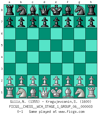 Last move : 0-1 2007 August 10 21:3:22 [Event "FICGS__CHESS__WCH_STAGE_1_GROUP_06__000003"] [Site "FICGS"] [Date "2007.07.11"] [Round "1"] [White "Gillz,Nicolas"] [Black "Kragujevcanin,Stole"] [Result "0-1"] [WhiteElo "1355"] [BlackElo "1600"] 0-1 This chess game has been lost on time (started : 2007.07.11 16:57:46) Player Black won this chess game. Follow this game move after move (download)In order to improve your game, you must study the endgame before everything else, for whereas the endings can be studied and mastered by themselves, the middle game and the opening must be studied in relation to the endgame. (Jose Raul Capablanca) Im Leben werden Partien nie so unstrittig gewonnen wie im Spiel (Emanuel Lasker) Los asuntos humanos son como una partida de Ajedrez: solo aquellos que no lo toman seriamente, pueden ser llamados buenos jugadores. (Hung Tzu Ch'eng) La solitude du joueur d'Echecs à l'approche du mat est semblable à celle du condamné. (Francis Szpiner) Experiences are the keys to life. (Daniel Parmet)