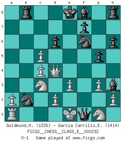 Last move : 0-1 2020 August 6 7:28:0 [Event "FICGS__CHESS__CLASS_E__000232"] [Site "FICGS"] [Date "2020.05.27"] [Round "1"] [White "Goldmund,Heike"] [Black "Garcia Carrillo,Exal"] [Result "0-1"] [WhiteElo "1226"] [BlackElo "1414"] 1.b4 e5 2.Bb2 d6 3.e3 Nf6 4.Nf3 Nbd7 5.c4 e4 6.Ng5 h6 7.Nh3 Ne5 8.Nf4 Bf5 9.g3 Nf3+ 10.Ke2 Ne5 11.Bg2 Bg4+ 12.f3 exf3+ 13.Kf2 fxg2 14.Qe1 gxh1Q 15.Qxh1 g5 16.Ne2 Nd3+ 17.Kf1 Nxb2 18.Qxb7 Rb8 19.Qxa7 Qc8 20.Qd4 Qf5+ 21.Ke1 Qf3 22.Nbc3 c5 23.bxc5 Bh3 24.Ng1 Qf1+ 0-1 Polish (Sokolsky) opening Promotion Queen by player Black (move 14) Player Black won this chess game. Follow this game move after move (download)Bobby just drops the pieces and they fall on the right squares. (Miguel Najdorf) Früher wurde jeder komplizierte Zug, jedes interessante Opfer mit großem Beifall und Enthusiasmus aufgenommen. Heute schaltet man einfach seinen Fritz an, und man kann sehen, was los ist, ob der Zug geht oder nicht. (Vladimir Kramnik) El muchacho (en ese entonces un niño de 12 años llamado Anatoly Karpov) no tiene ni idea de lo que es el Ajedrez y no hay futuro en absoluto para el en esta profesión. (Mikhail Botvinnik) Plusieurs personnes se sont demandées comment Tal faisait pour gagner... En fait, c'est très simple ! Il met ses pièces au centre de l'échiquier et les sacrifie quelque part ! (David Bronstein) The existence of forgetting has never been proved: We only know that some things don't come to mind when we want them. (Friedrich Nietzsche)