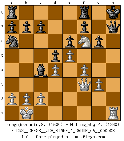 Last move : 1-0 2007 September 21 20:40:36 [Event "FICGS__CHESS__WCH_STAGE_1_GROUP_06__000003"] [Site "FICGS"] [Date "2007.07.11"] [Round "1"] [White "Kragujevcanin,Stole"] [Black "Willoughby,Peter"] [Result "1-0"] [WhiteElo "1600"] [BlackElo "1280"] 1.e4 e6 2.d4 d5 3.Nc3 Nf6 4.Bg5 Be7 5.e5 Nfd7 6.h4 Bxg5 7.hxg5 Qxg5 8.Nh3 Qh6 9.g3 g6 10.Nb5 Na6 11.f4 Nb6 12.Qf3 Qg7 13.O-O-O Bd7 14.Kb1 O-O 15.Nf2 Nc4 16.Ng4 Bxb5 17.Nf6+ Kh8 18.Bxc4 Bxc4 19.Rxh7+ Qxh7 20.Rh1 1-0 French : Albin-Alekhine-Chatard attack Queenside Castling by player White (move 13) Kingside Castling by player Black (move 14) Player White won this chess game. Follow this game move after move (download)Kasparov : J'adoube , Ivanchuk : S'il vous plaît ! (Garry Kasparov & Vassily Ivanchuk, Linares 1997) Die meiste Zeit treffe ich auf Gegner, die meine Enkel sein könnten. Ich bin da, um ihnen zu zeigen, dass sie von mir noch einiges lernen können. (Viktor Kortschnoi) Vive, pierde y aprende al observar a tu oponente como ganar. (Amber Steenbock) D'abord les bases : Jouez et étudiez, puis étudiez et jouez, ensuite jouez et étudiez, puis étudiez et jouez. Deuxièmement : Donnez toujours le meilleur de vous-même ! (Ken Smith) When you don't know what to do, walk fast and look worried. (Anonymous)